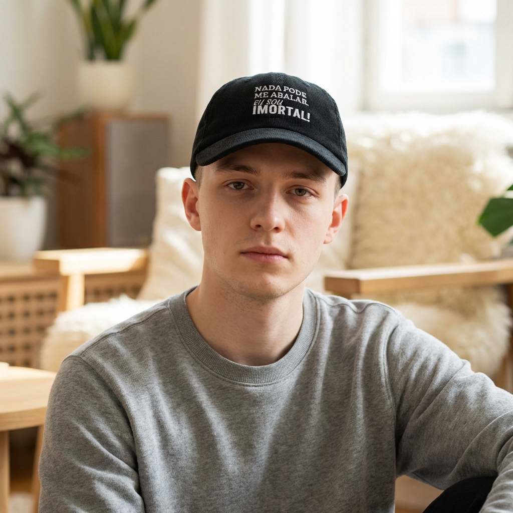 Um boné de veludo cotelê que carrega uma afirmação direta e silenciosamente poderosa: “Nada pode me abalar. Eu sou imortal!”. A textura macia e canelada cria um contraste elegante com a frase bordada, enquanto o perfil baixo e desestruturado mantém o visual natural e confortável. É um acessório pensado para quem prefere comunicar força interior com sobriedade — combina com camadas de outono, caminhadas urbanas sob o sol e rotinas onde estilo e identidade caminham juntos.