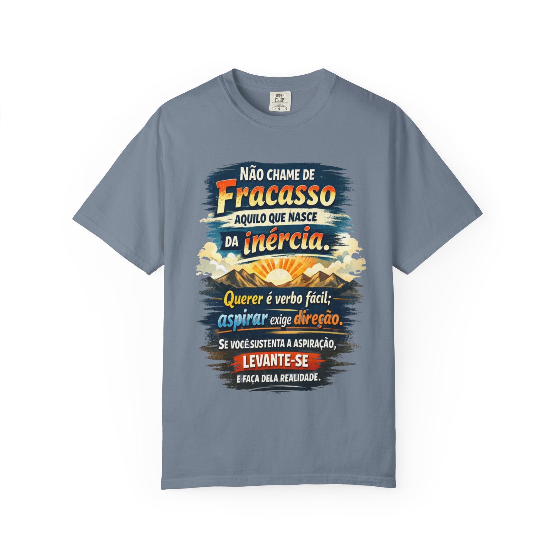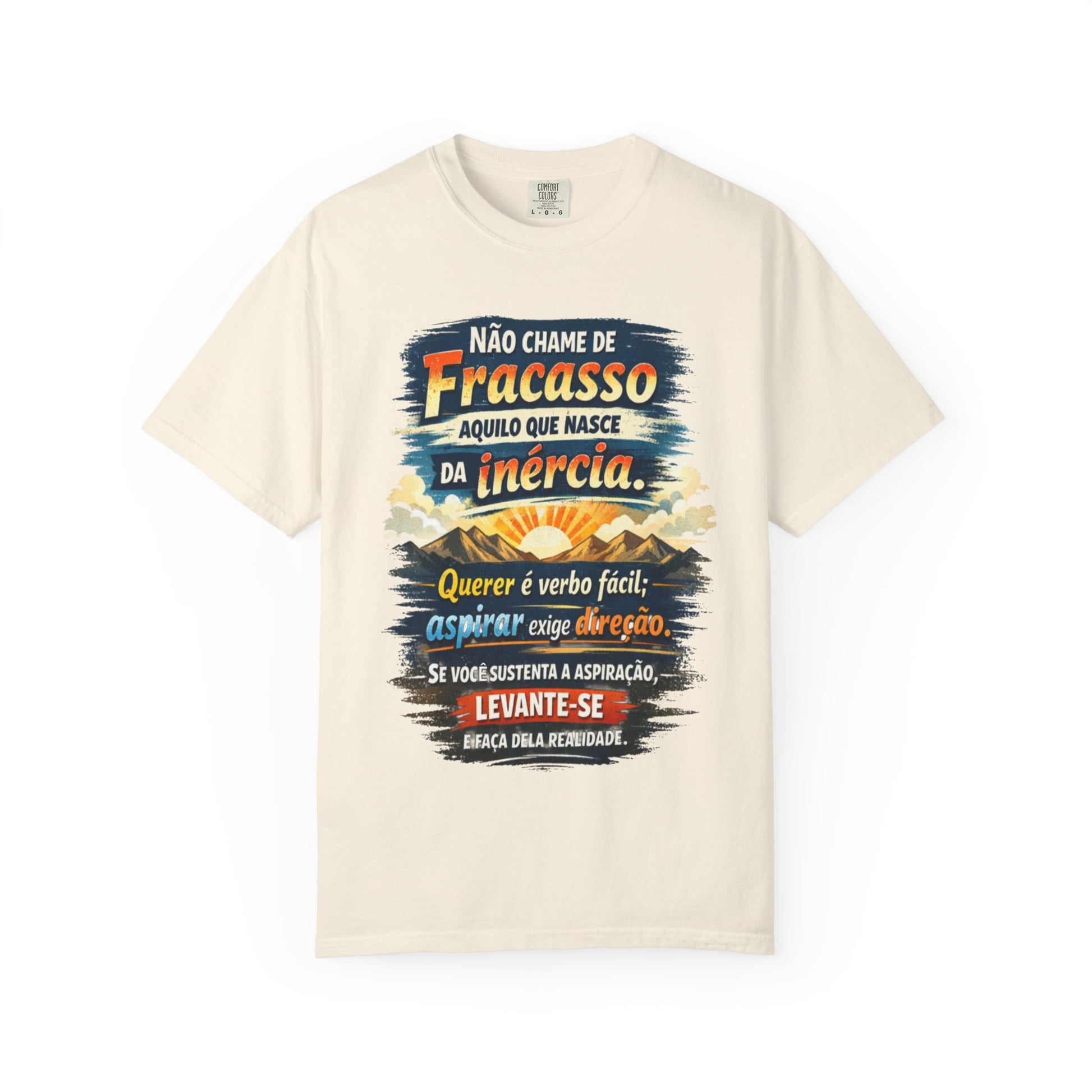 Emoldurada por convicção serena, esta camiseta traz uma afirmação em português: não chame de fracasso o que nasceu da inércia. A frase repousa próxima ao coração — direta, honesta, exigente na medida certa.