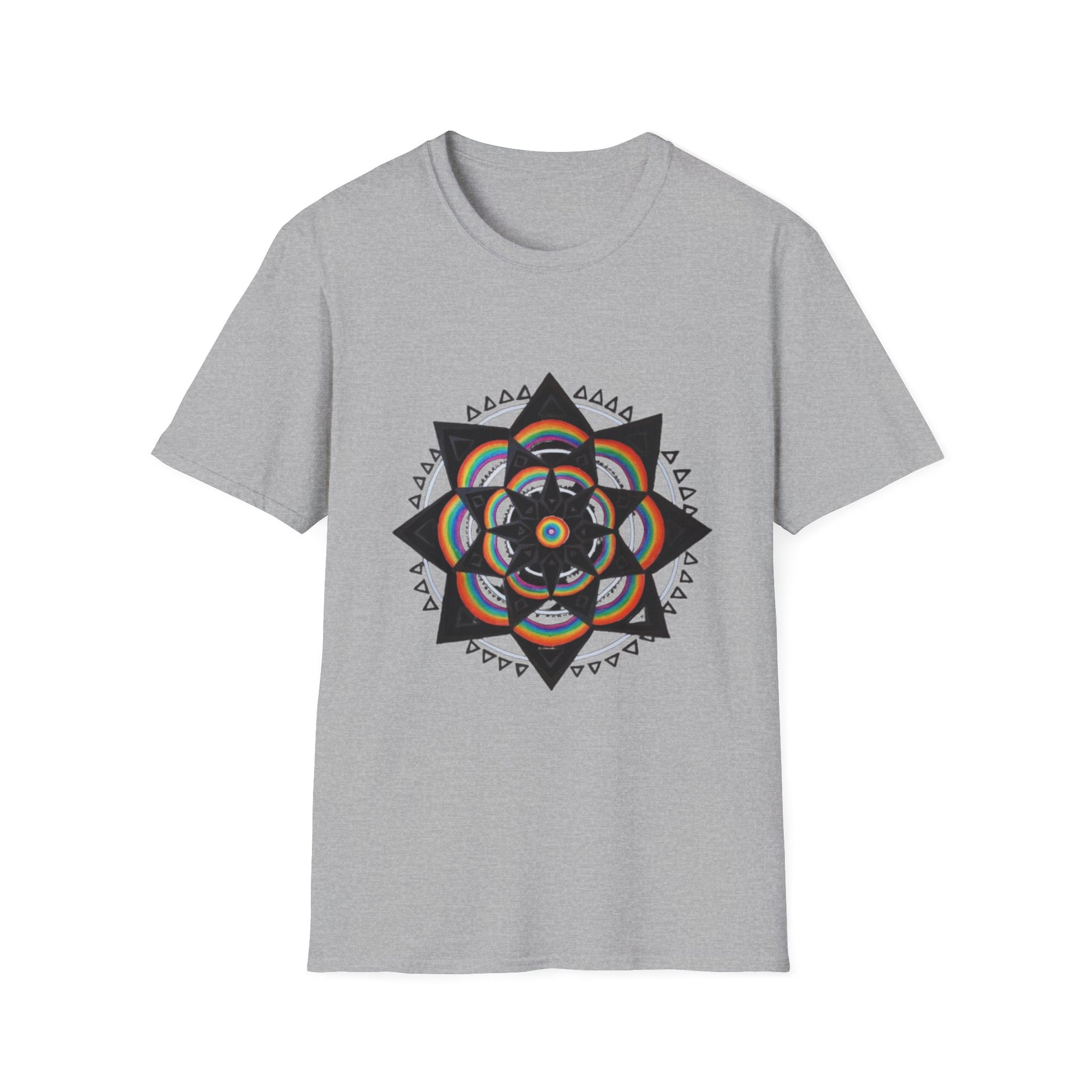 Esta camiseta estampada premium transforma meditação em vestuário. O desenho central traz uma mandala tribal com pétalas coloridas em arco-íris e geometria preta nítida — leitura contemplativa e moderna ao mesmo tempo.