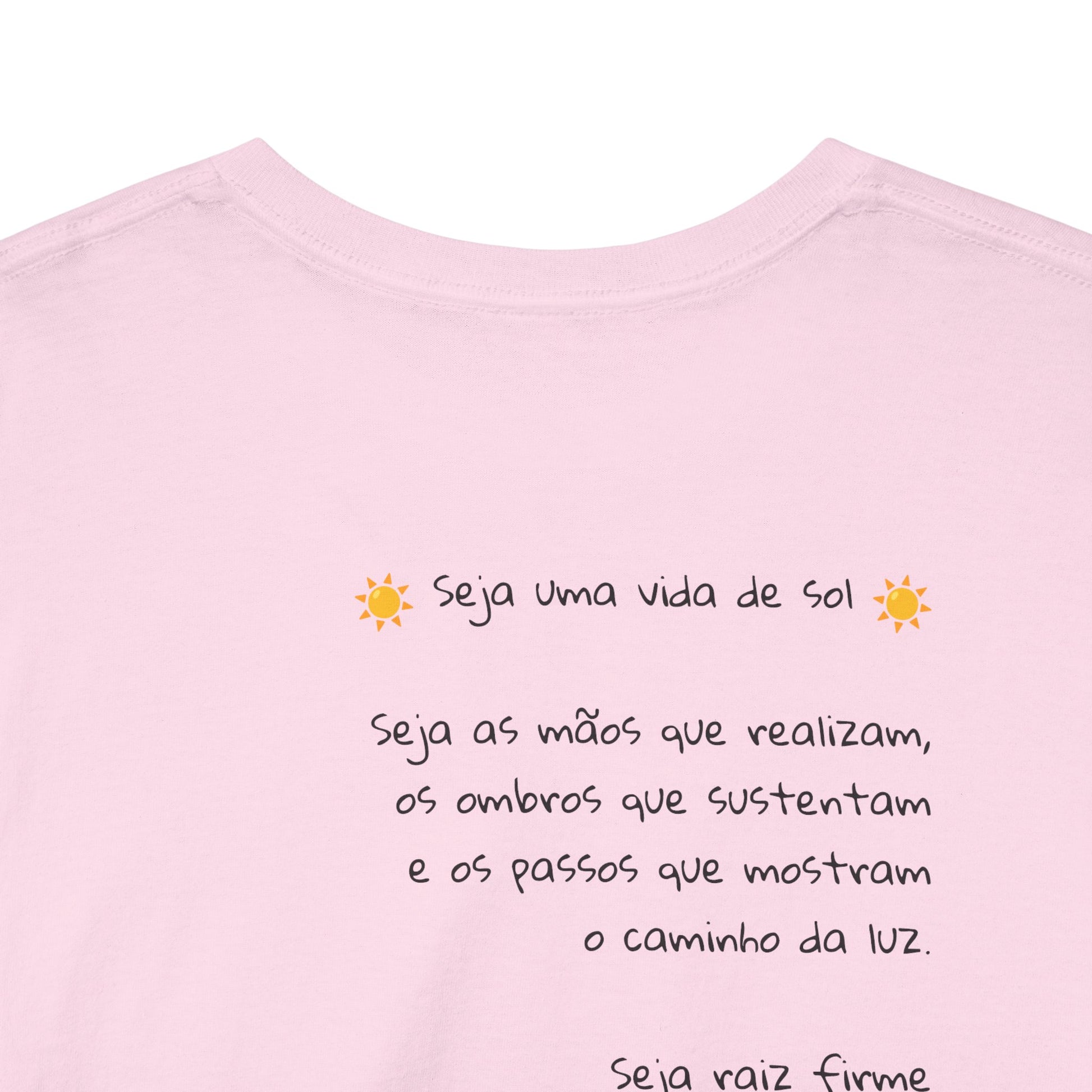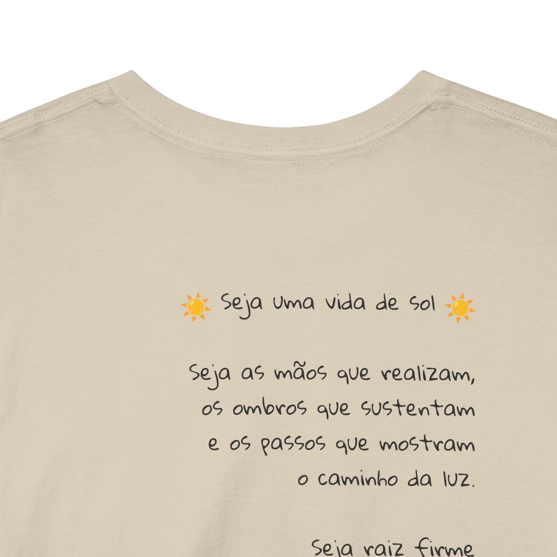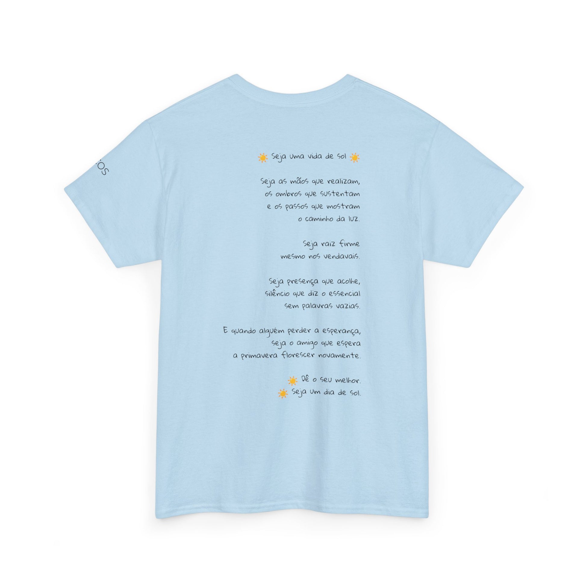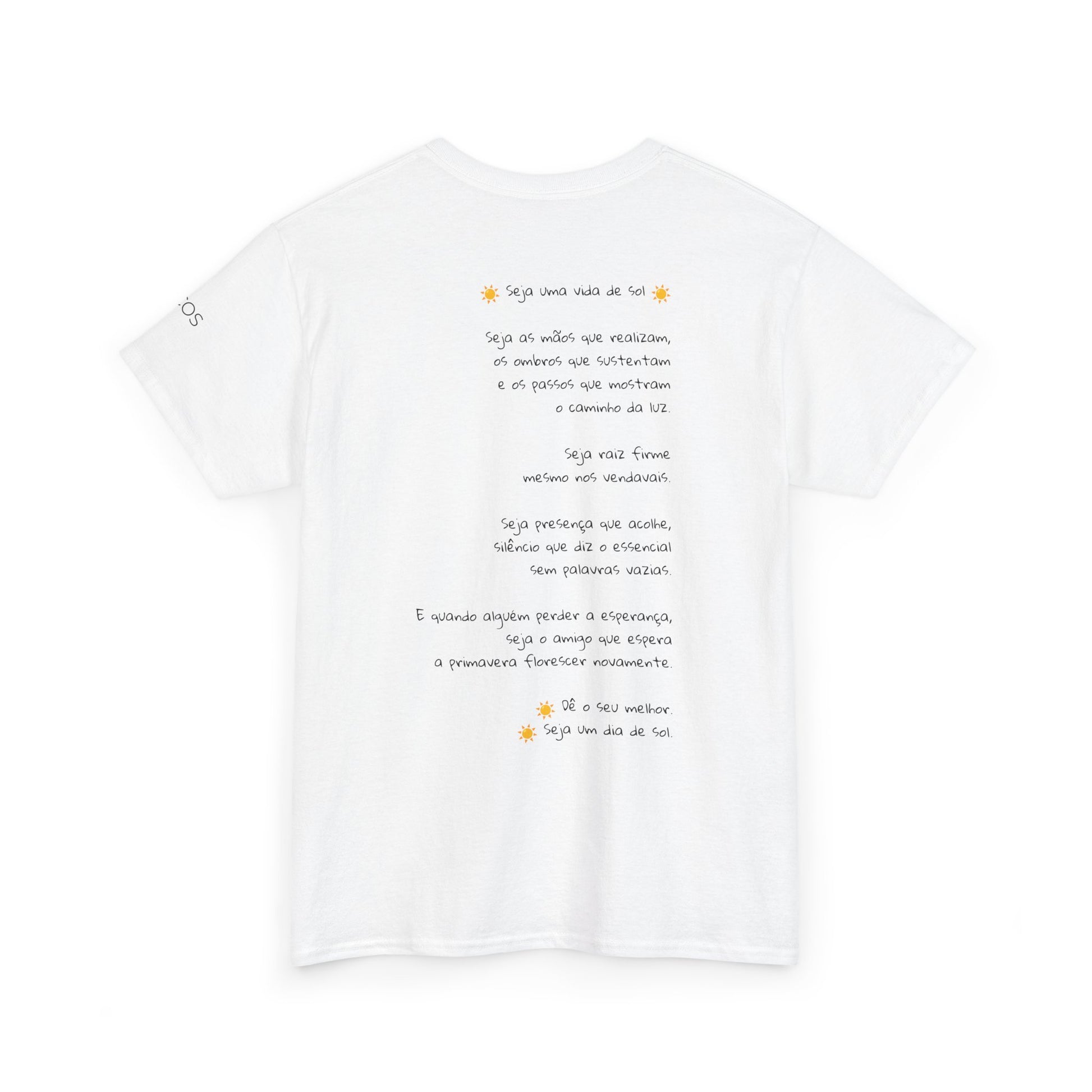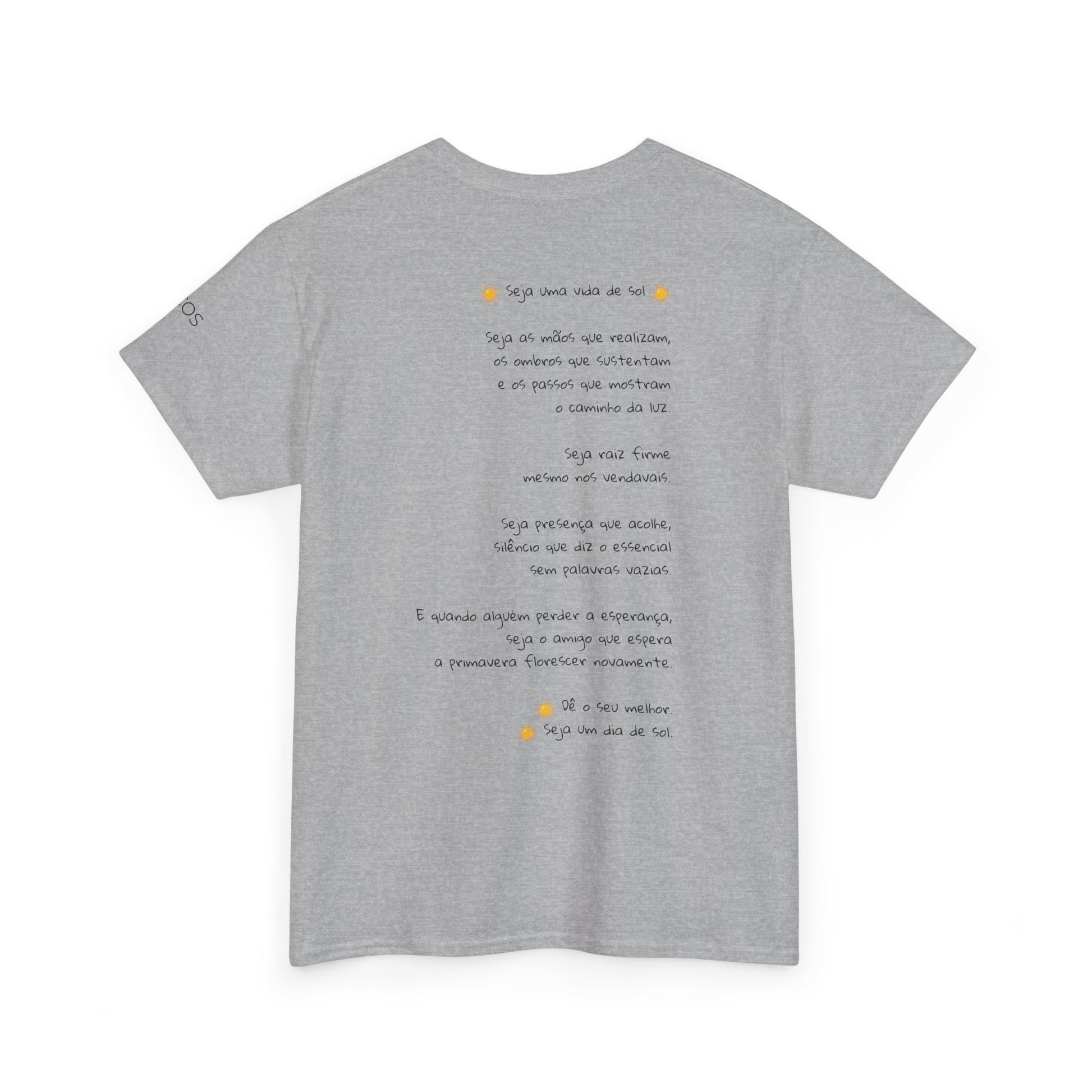 Esta camiseta traz no peito um poema curto e sereno, como um lembrete silencioso de permanecer firme mesmo quando os dias parecem nublados. A mensagem fala de presença, gentileza e constância — pequenas atitudes que iluminam os momentos difíceis e aquecem quem está por perto.